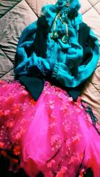 Una colorata camicia color verde petrolio tra bavari e rose applicate in tre D con un elegante fiocco ed una gonna di tulle fucsia resa particolare da uno strato di tulle nero a raggio di sole con sopra tralci di fiori a rilievo, il tutto reso elegante da un gilet nero con papillon verde stampato e calze con ricamo a rete . Il risultato è uno stile rock con retrò gotico, in versione elegante & moderna.