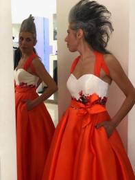 La zip si chiude ed è questo uno splendido abito bianco ed arancio con corpetto a tema floreale, per personalizzare l’abito arriva magicamente una spallina a torciglione creata in pochi istanti che rende unico l’abito ,ma al momento manca comunque qualcosa l’accessorio giusto una pochette doppio colore oro e argento con strass e poi loro le scarpe.